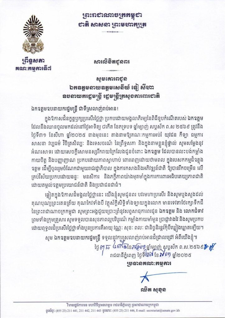 សារលិខិតជូនពររបស់ឯកឧត្តម ឈិត សុខុន ប្រធានគណៈកម្មការទី៧ព្រឹទ្ធសភា គោរពជូនឯកឧត្តមនាយឧត្តមសេនីយ៍ ទៀ សីហា ឧបនាយករដ្ឋមន្ត្រី រដ្ឋមន្ត្រីក្រសួងការពារជាតិ ក្នុងឱកាសដ៏នក្ខត្តឫក្សប្រសើរថ្លៃថ្លា ប្រកបដោយមង្គលាភិរម្យនៃពិធីខួបកំណើតរបស់ឯកឧត្តម ដែលនឹងឈានចូលមកដល់នៅថ្ងៃអាទិត្យ ទី៣១ ខែសីហា ឆ្នាំ២០២៥ ខាងមុខនេះ