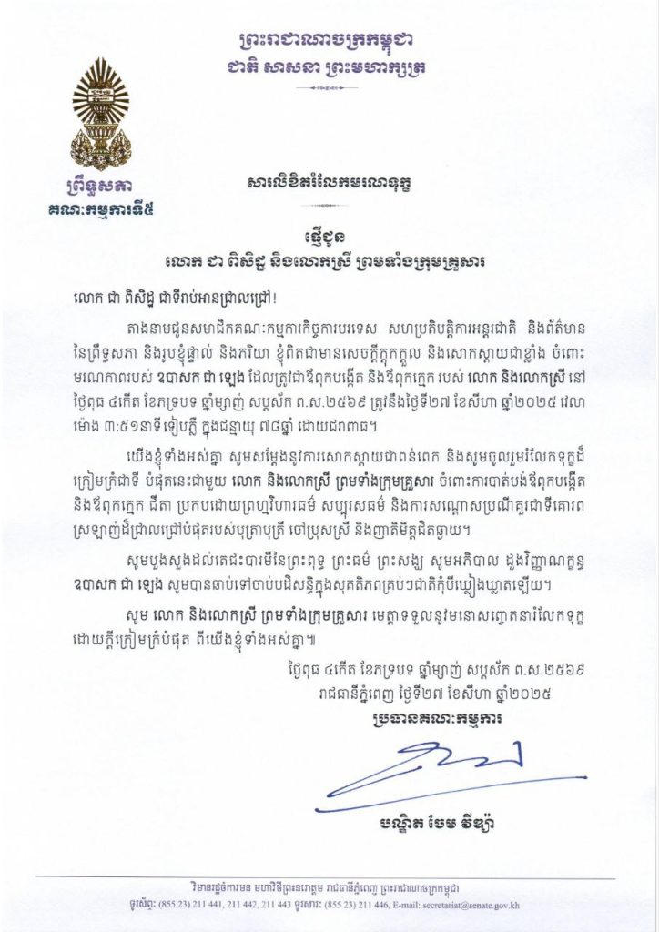 • សារលិខិតរំលែកមរណទុក្ខរបស់ឯកឧត្តមបណ្ឌិត ចែម វីឌ្យ៉ា ប្រធានគណៈកម្មការ​ទី៥ព្រឹទ្ធសភា ជូនលោក ជា ពិសិដ្ឋ និងលោកស្រី ព្រមទាំងក្រុមគ្រួសារ ចំពោះ មរណភាពរបស់ឧបាសក ជា ឡេង ដែលត្រូវជាឪពុកបង្កើត និងឪពុកក្មេក របស់ លោក និងលោកស្រី នៅថ្ងៃពុធ ទី២៧ ខែសីហា ឆ្នាំ២០២៥ វេលាម៉ោង ៣:៥១នាទីទៀបភ្លឺ ក្នុងជន្មាយុ ៧៨ឆ្នាំ ដោយជរាពាធ