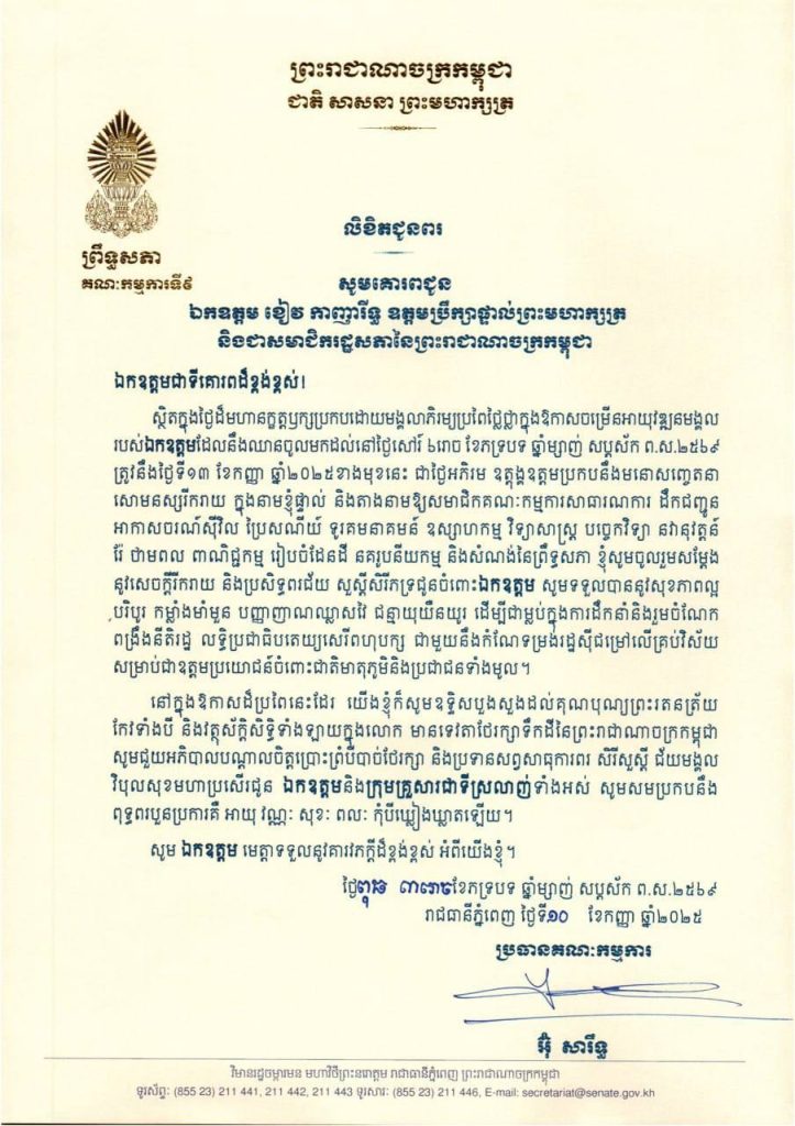 លិខិតជូនពររបស់ឯកឧត្តម អ៊ុ សារឹទ្ធ ប្រធានគណៈកម្មការទី៩ព្រឹទ្ធសភា គោរពជូនឯកឧត្តម ខៀវ កាញារីទ្ធ ឧត្តមប្រឹក្សាផ្ទាល់ព្រះមហាក្សត្រ និងជាសមាជិករដ្ឋសភានៃព្រះរាជាណាចក្រកម្ពុជា ក្នុងថ្ងៃដ៏មហានក្ខត្តឫក្សប្រកបដោយមង្គលាភិរម្យប្រពៃថ្លៃថ្លាក្នុងឱកាសចម្រើនអាយុវឌ្ឍនមង្គលរបស់ឯកឧត្តមដែលនឹងឈានចូលមកដល់នៅថ្ងៃសៅរ៍ ទី១៣ ខែកញ្ញា ឆ្នាំ២០២៥ខាងមុខនេះ