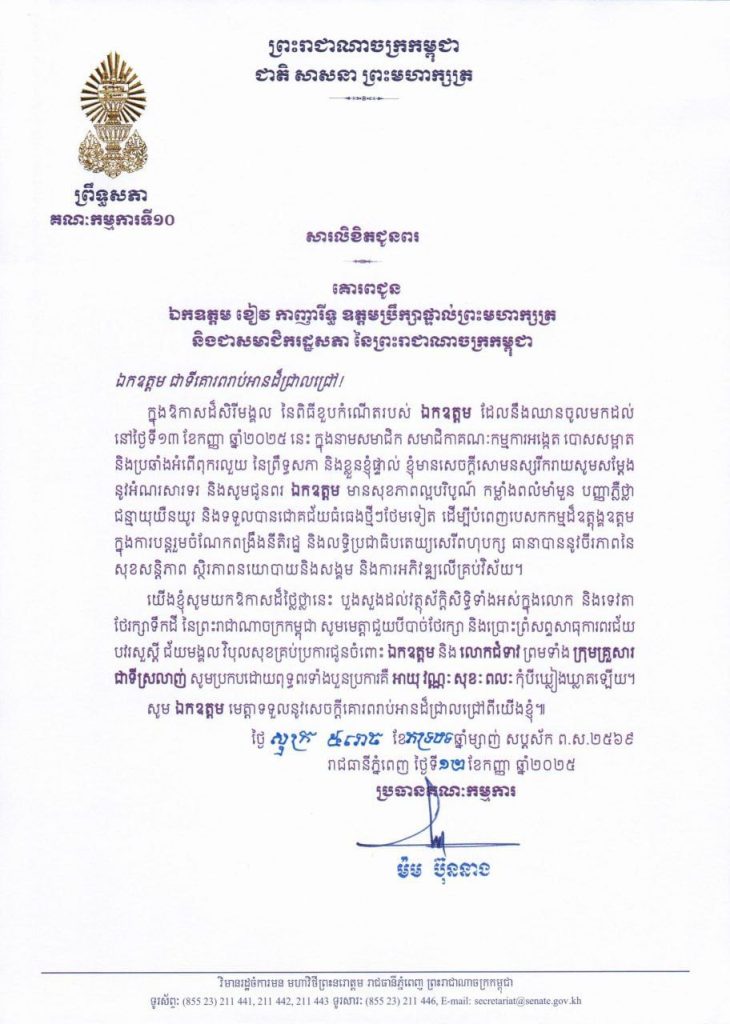 • សារលិខិតជូនពររបស់ឯកឧត្តម ម៉ម ប៊ុននាង ប្រធានគណៈកម្មការ​ទី១០ព្រឹទ្ធសភា គោរពជូនឯកឧត្តម ខៀវ កាញារីទ្ធ ឧត្តមប្រឹក្សាផ្ទាល់ព្រះមហាក្សត្រ និងជាសមាជិករដ្ឋសភា នៃព្រះរាជាណាចក្រកម្ពុជា ក្នុងឱកាស នៃពិធីខួបកំណើតរបស់ឯកឧត្តម ដែលនឹងឈានចូលមកដល់ នៅថ្ងៃទី១៣ ខែកញ្ញា ឆ្នាំ២០២៥ នេះ