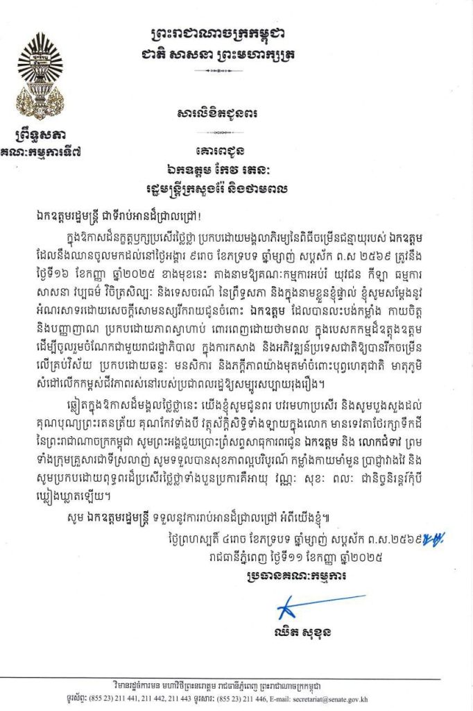 សារលិខិតជូនពររបស់ឯកឧត្តម ឈិត សុខុន ប្រធានគណៈកម្មការទី៧ព្រឹទ្ធសភា គោរពជូនឯកឧត្តម កែវ រតនៈ រដ្ឋមន្ត្រីក្រសួងរ៉ែ និងថាមពល ក្នុងឱកាសនៃពិធីចម្រើនជន្មាយុរបស់ឯកឧត្តម ដែលនឹងឈានចូលមកដល់នៅថ្ងៃអង្គារ ទី១៦ ខែកញ្ញា ឆ្នាំ២០២៥ ខាងមុខនេះ