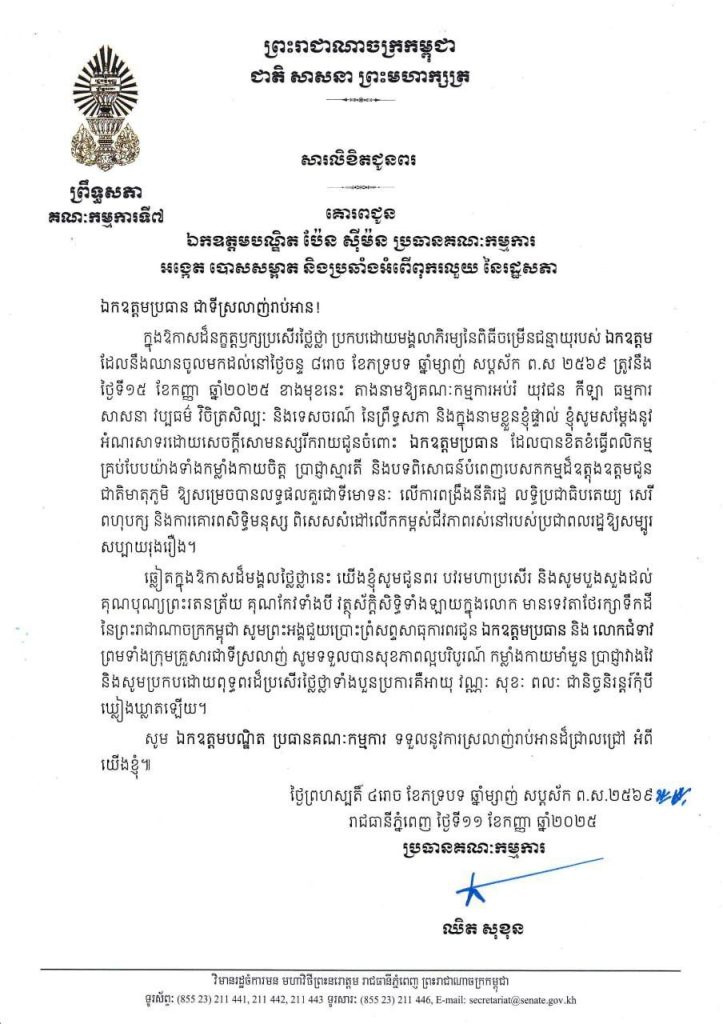 សារលិខិតជូនពររបស់ឯកឧត្តម ឈិត សុខុន ប្រធានគណៈកម្មការទី៧ព្រឹទ្ធសភា គោរពជូនឯកឧត្តមបណ្ឌិត ប៉ែន ស៊ីម៉ន ប្រធានគណៈកម្មការ អង្កេត បោសសម្អាត និងប្រឆាំងអំពើពុករលួយ នៃរដ្ឋសភា ក្នុងឱកាស នៃពិធីចម្រើនជន្មាយុរបស់ឯកឧត្តម ដែលនឹងឈានចូលមកដល់នៅថ្ងៃចន្ទ ទី១៥ ខែកញ្ញា ឆ្នាំ២០២៥ ខាងមុខនេះ
