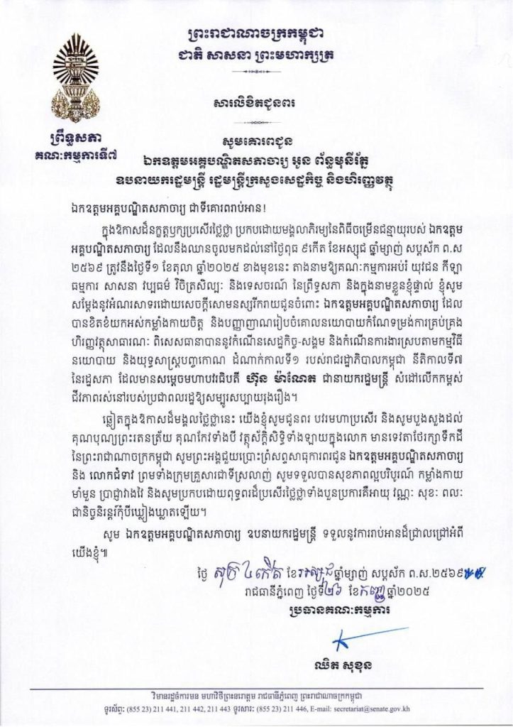 សារលិខិតជូនពររបស់ឯកឧត្តម ឈិត សុខុន ប្រធានគណៈកម្មការទី៧ព្រឹទ្ធសភា គោរពជូនឯកឧត្តមអគ្គបណ្ឌិតសភាចារ្យ អូន ព័ន្ធមុនីរ័ត្ន ឧបនាយករដ្ឋមន្ត្រី រដ្ឋមន្ត្រីក្រសួងសេដ្ឋកិច្ច និងហិរញ្ញវត្ថុ ក្នុងឱកាសដ៏នក្ខត្តឫក្សប្រសើរថ្លៃថ្លា ប្រកបដោយមង្គលាភិរម្យនៃពិធីចម្រើនជន្មាយុរបស់ ឯកឧត្តម អគ្គបណ្ឌិតសភាចារ្យ ដែលនឹងឈានចូលមកដល់នៅថ្ងៃពុធ ទី១ ខែតុលា ឆ្នាំ២០២៥ ខាងមុខនេះ