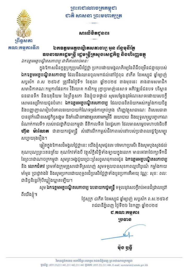 សារលិខិតជូនពររបស់ឯកឧត្តមបណ្ឌិត ម៉ុង ឫទ្ធី ប្រធានគណៈកម្មការទី៣ព្រឹទ្ធសភា គោរពជូនឯកឧត្តមអគ្គបណ្ឌិតសភាចារ្យ អូន ព័ន្ធមុនីរ័ត្ន ឧបនាយករដ្ឋមន្ត្រី រដ្ឋមន្ត្រីក្រសួងសេដ្ឋកិច្ច និងហិរញ្ញវត្ថុ ក្នុងឱកាសដ៏នក្ខត្តឫក្សប្រសើរថ្លៃថ្លា ប្រកបដោយមង្គលាភិរម្យនៃពិធីចម្រើនជន្មាយុរបស់ឯកឧត្តមអគ្គបណ្ឌិតសភាចារ្យ ដែលនឹងឈានចូលមកដល់នៅថ្ងៃពុធ ទី១ ខែតុលា ឆ្នាំ២០២៥ ខាងមុខនេះ