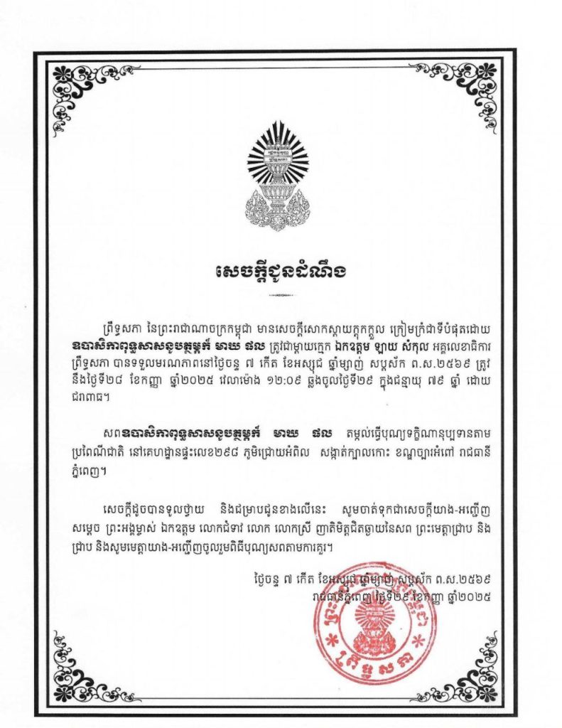 សេចក្តីជូនដំណឹង ព្រឹទ្ធសភា នៃព្រះរាជាណាចក្រកម្ពុជា មានសេចក្តីសោកស្តាយក្ដុកក្ដួល ក្រៀមក្រំជាទីបំផុតដោយ ឧបាសិកាពុទ្ធសាសនូបត្ថម្ភក៏ មាឃ ផល ត្រូវជាម្តាយក្មេក ឯកឧត្តម ឡាយ សំកុល អគ្គលេខាធិការព្រឹទ្ធសភា បានទទួលមរណភាពនៅថ្ងៃចន្ទ ទី២៨ ខែកញ្ញា ឆ្នាំ២០២៥ វេលាម៉ោង ១២:០៩ ឆ្លងចូលថ្ងៃទី២៩ ក្នុងជន្មាយុ ៧៩ឆ្នាំ ដោយជរាពាធ