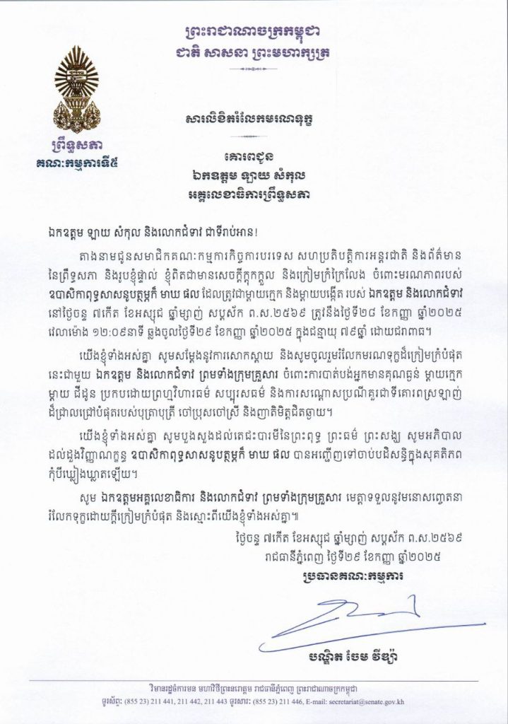 សារលិខិតរំលែកមរណទុក្ខរបស់ឯកឧត្តមបណ្ឌិត ចែម វីឌ្យ៉ា ប្រធានគណៈកម្មការទី៥ព្រឹទ្ធសភា គោរពជូនឯកឧត្តម ឡាយ សំកុល អគ្គលេខាធិការព្រឹទ្ធសភា ចំពោះមរណភាពរបស់ ឧបាសិកាពុទ្ធសាសនូបត្ថម្ភក៏ មាឃ ផល ដែលត្រូវជាម្តាយក្មេក និងម្តាយបង្កើតរបស់ឯកឧត្តម និងលោកជំទាវ នៅថ្ងៃចន្ទ ទី២៨ ខែកញ្ញា ឆ្នាំ២០២៥ វេលាម៉ោង ១២:០៩នាទី ឆ្លងចូលថ្ងៃទី២៩ ខែកញ្ញា ឆ្នាំ២០២៥ ក្នុងជន្មាយុ ៧៩ឆ្នាំ ដោយជរាពាធ