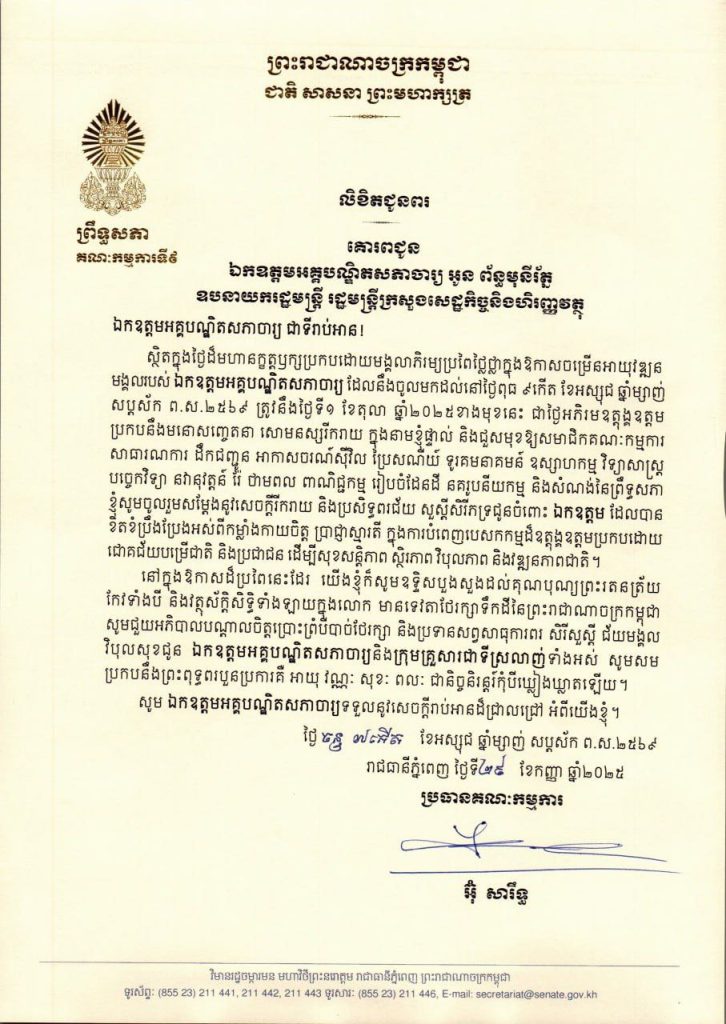 • លិខិតជូនពររបស់ឯកឧត្តម អ៊ុំ សារឹទ្ធ ប្រធានគណៈកម្មការ​ទី៩ព្រឹទ្ធសភា​ គោរពជូនឯកឧត្តមអគ្គបណ្ឌិតសភាចារ្យ អូន ព័ន្ធមុនីរ័ត្ន ឧបនាយករដ្ឋមន្ត្រី រដ្ឋមន្ត្រីក្រសួងសេដ្ឋកិច្ចនិងហិរញ្ញវត្ថុ ក្នុងថ្ងៃដ៏មហានក្ខត្តឫក្សប្រកបដោយមង្គលាភិរម្យប្រពៃថ្លៃថ្លាក្នុងឱកាសចម្រើនអាយុវឌ្ឍន មង្គលរបស់ឯកឧត្តមអគ្គបណ្ឌិតសភាចារ្យ ដែលនឹងចូលមកដល់នៅថ្ងៃពុធ ទី១ ខែតុលា ឆ្នាំ២០២៥ខាងមុខនេះ