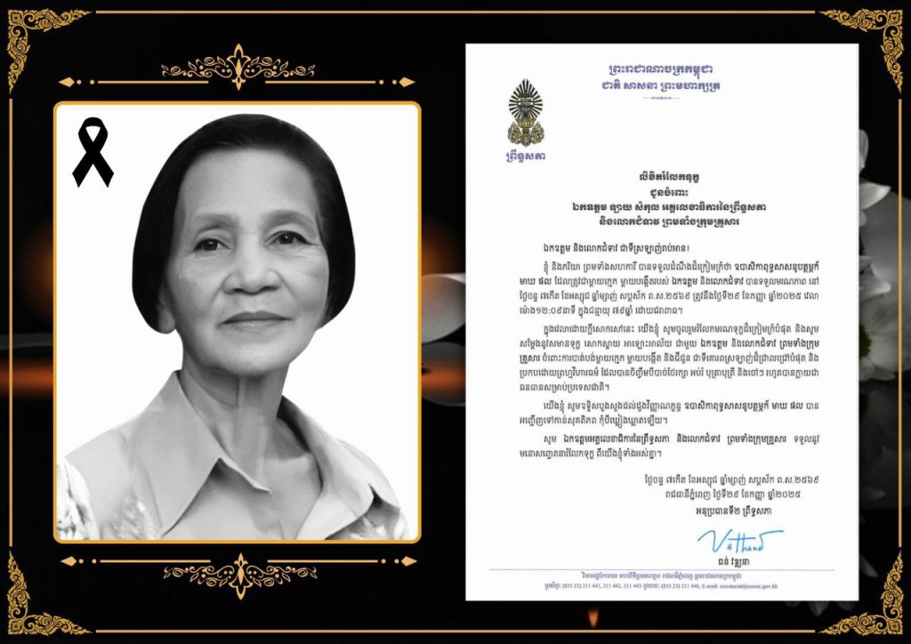 • លិខិតរំលែកទុក្ខរបស់ឯកឧត្តមបណ្ឌិត ធន់ វឌ្ឍនា អនុប្រធាន​ទី២ព្រឹទ្ធសភា នៃព្រះរាជាណាចក្រកម្ពុជា ជូនឯកឧត្តម ឡាយ សំកុល អគ្គលេខាធិការព្រឹទ្ធសភា និងលោកជំទាវ ព្រមទាំងក្រុមគ្រួសារ ចំពោះ​មរណភាព​របស់ឧបាសិកាពុទ្ធសាសនូបត្ថម្ភក៍ មាឃ ផល ដែលត្រូវជាម្តាយក្មេក ម្តាយបង្កើតរបស់ ឯកឧត្តម និងលោកជំទាវ បានទទួលមរណភាពនៅថ្ងៃចន្ទ ទី២៩ ខែកញ្ញា ឆ្នាំ២០២៥ វេលា ម៉ោង១២:០៩នាទី ក្នុងជន្មាយុ ៧៩ឆ្នាំ ដោយជរាពាធ