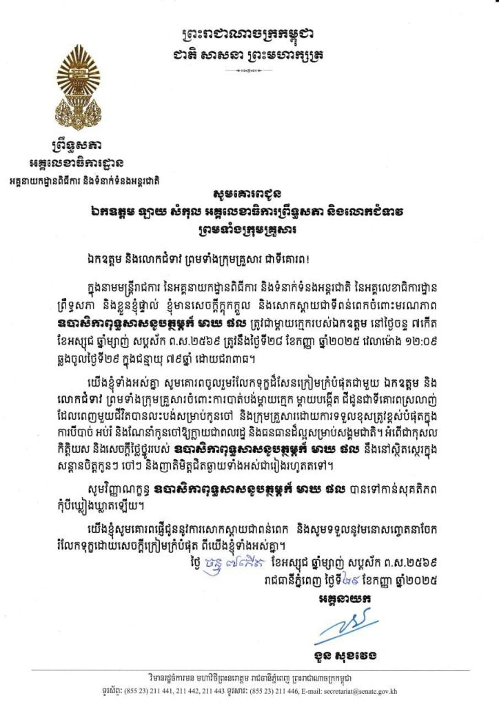 លិខិតរំលែកទុក្ខរបស់ឯកឧត្តម ងួន សុខវេង អគ្គនាយក នៃអគ្គនាយកដ្ឋានពិធីការ និងទំនាក់ទំនងអន្តរជាតិ គោរពជូនឯកឧត្តម ឡាយ សំកុល អគ្គលេខាធិការព្រឹទ្ធសភា និងលោកជំទាវ ព្រមទាំងក្រុមគ្រួសារ ចំពោះមរណភាព ឧបាសិកាពុទ្ធសាសនូបត្ថម្ភក៏ មាឃ ផល ត្រូវជាម្តាយក្មេករបស់ឯកឧត្តម នៅថ្ងៃចន្ទ ទី២៨ ខែកញ្ញា ឆ្នាំ២០២៥ វេលាម៉ោង ១២:០៩ ឆ្លងចូលថ្ងៃទី២៩ ក្នុងជន្មាយុ ៧៩ឆ្នាំ ដោយជរាពាធ