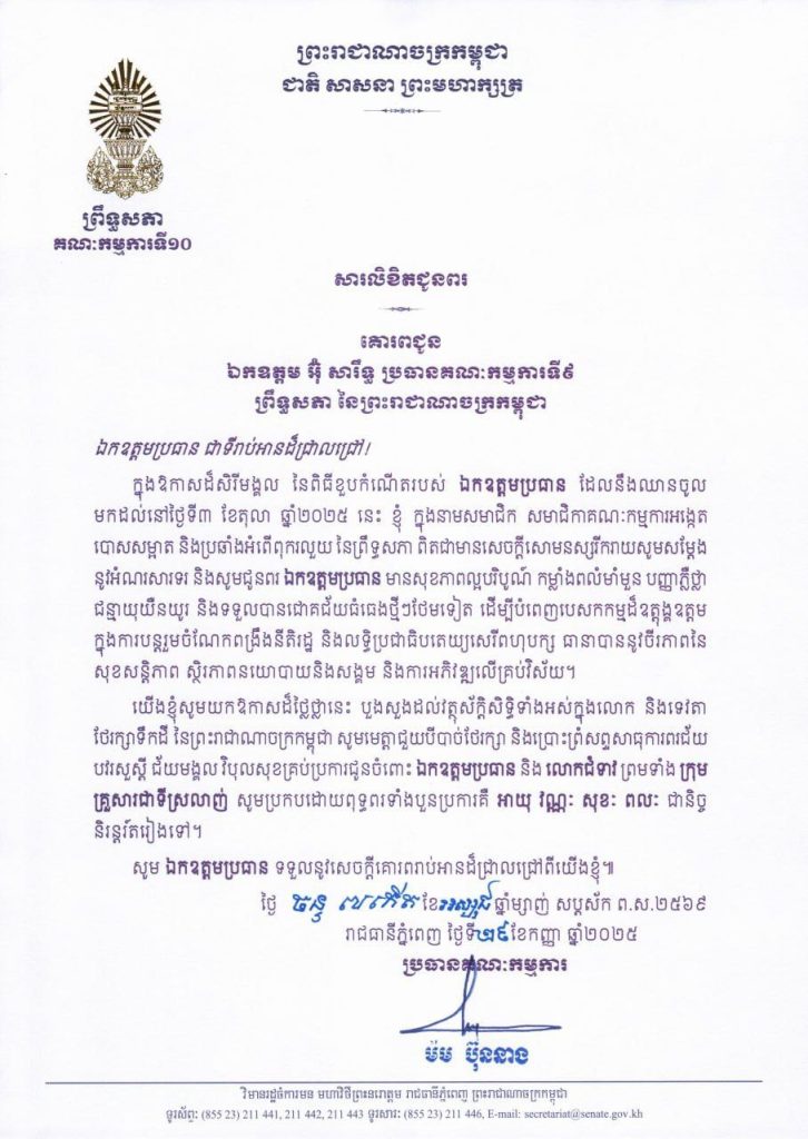 សារលិខិតជូនពររបស់ឯកឧត្តម ម៉ម ប៊ុននាង ប្រធានគណៈកម្មការទី១០ព្រឹទ្ធសភា គោរពជូនឯកឧត្តម អ៊ុ សារឹទ្ធ ប្រធានគណៈកម្មការទី៩ព្រឹទ្ធសភា ក្នុងឱកាសដ៏សិរីមង្គល នៃពិធីខួបកំណើតរបស់ឯកឧត្តមប្រធាន ដែលនឹងឈានចូលមកដល់នៅថ្ងៃទី៣ ខែតុលា ឆ្នាំ២០២៥ នេះ