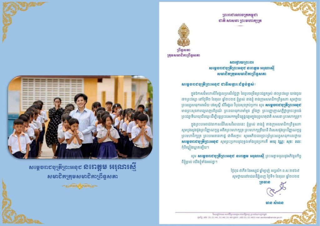 សារថ្វាយព្រះពររបស់លោកជំទាវ មាន សំអាន ប្រធានក្រុមសមាជិកាព្រឹទ្ធសភា ថ្វាយ សម្តេចរាជបុត្រីព្រះអនុជ នរោត្តម អរុណរស្មី សមាជិកក្រុមសមាជិកាព្រឹទ្ធសភា ក្នុងឱកាសដ៏មហាសិរីមង្គលប្រសើរថ្លៃថ្លា នៃខួបចម្រើនព្រះជន្មគម្រប់ ៧០ព្រះវស្សា យាងចូល ៧១ព្រះវស្សា នៅថ្ងៃទី២ ខែតុលា ឆ្នាំ២០២៥