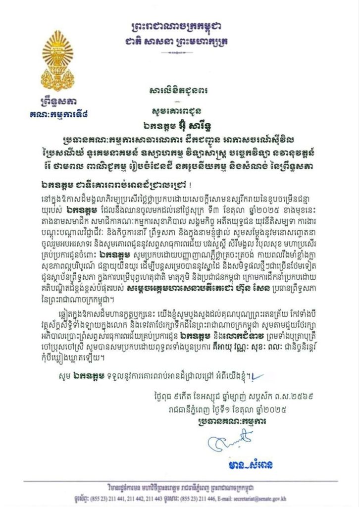 សារលិខិតជូនពររបស់លោកជំទាវ មាន សំអាន ប្រធានគណៈកម្មការទី៨ព្រឹទ្ធសភា គោរពជូនឯកឧត្តម អ៊ុំ សារឹទ្ធ ប្រធានគណៈកម្មការទី៩ព្រឹទ្ធសភា ក្នុងឱកាសនៃខួបចម្រើនជន្មាយុរបស់ ឯកឧត្តម ដែលនឹងឈានចូលមកដល់នៅថ្ងៃសុក្រ ទី៣ ខែតុលា ឆ្នាំ២០២៥ ខាងមុខនេះ