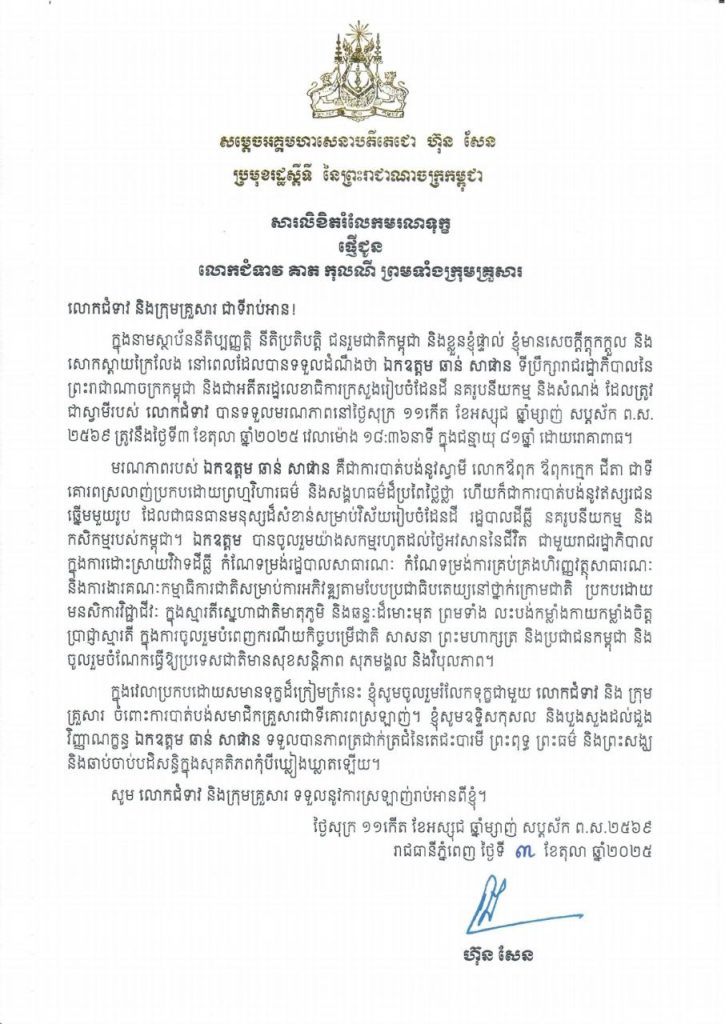 • សារលិខិតរំលែកមរណទុក្ខរបស់សម្តេចអគ្គមហាសេនាបតីតេជោ ហ៊ុន សែន ប្រមុខរដ្ឋស្តីទី នៃព្រះរាជាណាចក្រកម្ពុជា ជូនលោកជំទាវ គាត កុលណី ព្រមទាំងក្រុមគ្រួសារ ចំពោះ​មរណភាព​ ឯកឧត្តម ឆាន់ សាផាន ទីប្រឹក្សារាជរដ្ឋាភិបាលនៃ ព្រះរាជាណាចក្រកម្ពុជា និងជាអតីតរដ្ឋលេខាធិការក្រសួងរៀបចំដែនដី នគរូបនីយកម្ម និងសំណង់ ដែលត្រូវជាស្វាមីរបស់ លោកជំទាវ បានទទួលមរណភាពនៅថ្ងៃសុក្រ ទី៣ ខែតុលា ឆ្នាំ២០២៥ វេលាម៉ោង ១៨:៣៦នាទី ក្នុងជន្មាយុ ៨១ឆ្នាំ ដោយរោគាពាធ