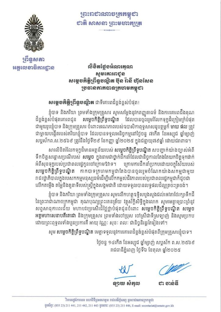 លិខិតថ្លែងអំណរគុណរបស់ឯកឧត្តម ឡាយ សំកុល អគ្គលេខាធិការព្រឹទ្ធសភា និងលោកជំទាវ ព្រមទាំងក្រុមគ្រួសារ គោរពជូន សម្តេចកិត្តិព្រឹទ្ធបណ្ឌិត ប៊ុន រ៉ានី ហ៊ុនសែន ប្រធានកាកបាទក្រហមកម្ពុជា ដែលបានចូលរួមរំលែកទុក្ខដ៏ក្រៀមក្រំបំផុត ចំពោះមរណភាពឧបាសិកាពុទ្ធសាសនូបត្ថម្ភក៏ មាឃ ផល ត្រូវជាម្តាយបង្កើតរបស់ភរិយាឯកឧត្តម ឡាយ សំកុល ដែលបានទទួលអនិច្ចកម្មនៅថ្ងៃចន្ទ ៧កើត ខែអស្សុជ ឆ្នាំម្សាញ់ សប្តស័កព.ស.២៥៦៩ ត្រូវនឹងថ្ងៃទី២៩ ខែកញ្ញា ឆ្នាំ២០២៥ ក្នុងជន្មាយុ៧៩ឆ្នាំ ដោយជរាពាធ