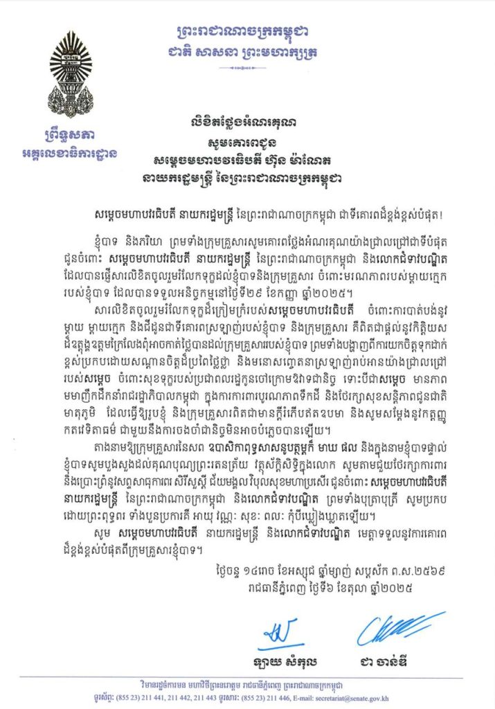 លិខិតថ្លែងអំណរគុណរបស់ឯកឧត្តម ឡាយ សំកុល អគ្គលេខាធិការព្រឹទ្ធសភា និងលោកជំទាវ ព្រមទាំងក្រុមគ្រួសារ គោរពជូន សម្តេចមហាបវរធិបតី ហ៊ុន ម៉ាណែត នាយករដ្ឋមន្ត្រី នៃព្រះរាជាណាចក្រកម្ពុជា ដែលបានចូលរួមរំលែកទុក្ខដ៏ក្រៀមក្រំបំផុត ចំពោះមរណភាពឧបាសិកាពុទ្ធសាសនូបត្ថម្ភក៏ មាឃ ផល ត្រូវជាម្តាយបង្កើតរបស់ភរិយាឯកឧត្តម ឡាយ សំកុល ដែលបានទទួលអនិច្ចកម្មនៅថ្ងៃចន្ទ ៧កើត ខែអស្សុជ ឆ្នាំម្សាញ់ សប្តស័កព.ស.២៥៦៩ ត្រូវនឹងថ្ងៃទី២៩ ខែកញ្ញា ឆ្នាំ២០២៥ ក្នុងជន្មាយុ៧៩ឆ្នាំ ដោយជរាពាធ