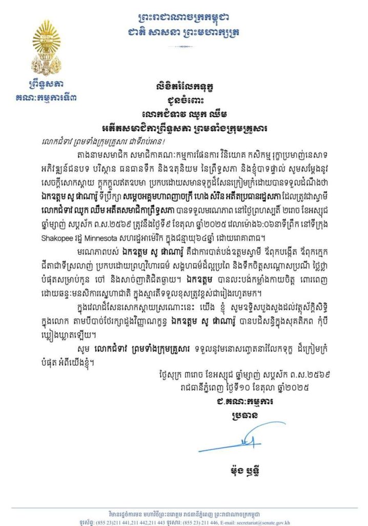លិខិតរំលែកទុក្ខរបស់ឯកឧត្តមបណ្ឌិត ម៉ុង ឫទ្ធី ប្រធានគណៈកម្មការទី៣ព្រឹទ្ធសភា ជូនចំពោះលោកជំទាវ ឈូក ឈឹម អតីតសមាជិកាព្រឹទ្ធសភា ព្រមទាំងក្រុមគ្រួសារ ចំពោះមរណភាពឯកឧត្តម សូ ផាណារ៉ូ ទីប្រឹក្សាសម្តេចអគ្គមហាពញាចក្រី ហេង សំរិន អតីតប្រធានរដ្ឋសភា ដែលត្រូវជាស្វាមីលោកជំទាវ បានទទួលមរណភាព នៅថ្ងៃព្រហស្បតិ៍ ទី៩ ខែតុលា ឆ្នាំ២០២៥ វេលាម៉ោង៦:០៦នាទីព្រឹក នៅទីក្រុង Shakopee រដ្ឋ Minnesota សហរដ្ឋអាម៉េរិក ក្នុងជន្មាយុ៦៤ឆ្នាំ ដោយរោគាពាធ