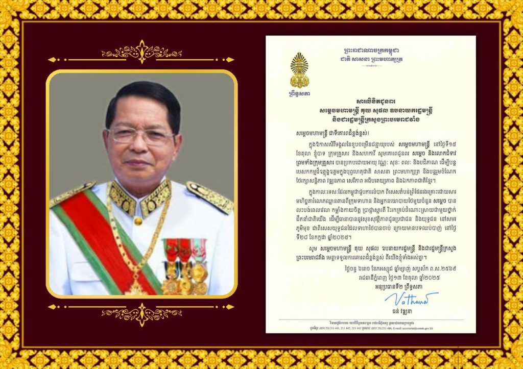 សារលិខិតជូនពររបស់ឯកឧត្តមបណ្ឌិត ធន់ វឌ្ឍនា អនុប្រធានទី២ព្រឹទ្ធសភា គោរពជូនសម្តេចមហាមន្ត្រី គុយ សុផល ឧបនាយករដ្ឋមន្ត្រី និងជារដ្ឋមន្ត្រីក្រសួងព្រះបរមរាជវាំង ក្នុងឱកាសសិរីមង្គលនៃខួបចម្រើនជន្មាយុរបស់សម្តេចមហាមន្ត្រី នៅថ្ងៃទី១៥ ខែតុលា ឆ្នាំ២០២៥នេះ