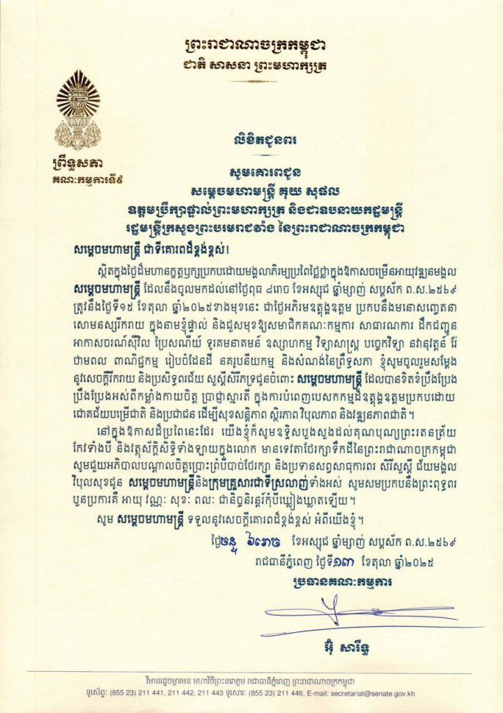 លិខិតជូនពររបស់ឯកឧត្តម អ៊ុំ សារឹទ្ធ ប្រធានគណៈកម្មការទី៩ព្រឹទ្ធសភា គោរពជូនសម្តេចមហាមន្ត្រី គុយ សុផល ឧត្តមក្រុមប្រឹក្សាផ្ទាល់ព្រះមហាក្សត្រ និងជាឧបនាយកដ្ឋមន្ត្រី រដ្ឋមន្ត្រីក្រសួងព្រះបរមរាជវាំង នៃព្រះរាជាណាចក្រកម្ពុជា ក្នុងឱកាសចម្រើនអាយុវឌ្ឍនមង្គល សម្តេចមហាមន្ត្រី ដែលនឹងចូលមកដល់នៅថ្ងៃពុធ ទី១៥ ខែតុលា ឆ្នាំ២០២៥ខាងមុខនេះ
