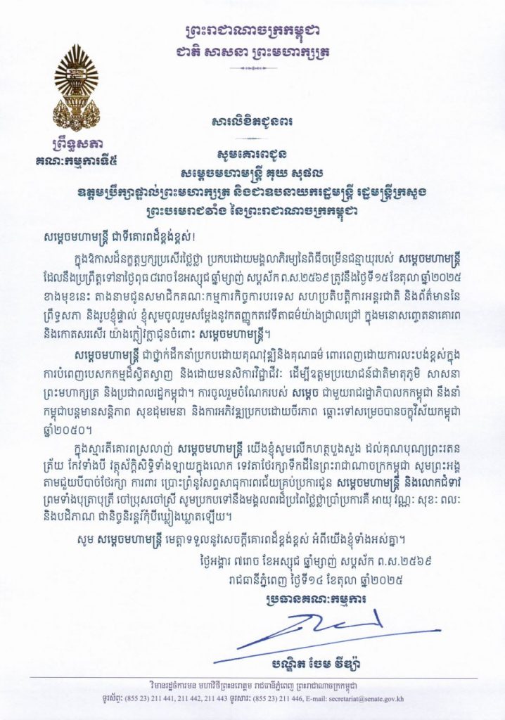 សារលិខិតជូនពររបស់ឯកឧត្តមបណ្ឌិត ចែម វីឌ្យ៉ា ប្រធានគណៈកម្មការទី៥ព្រឹទ្ធសភា គោរពជូនសម្តេចមហាមន្ត្រី គុយ សុផល ឧត្តមប្រឹក្សាផ្ទាល់ព្រះមហាក្សត្រ និងជាឧបនាយករដ្ឋមន្ត្រី រដ្ឋមន្ត្រីក្រសួង ព្រះបរមរាជវាំង នៃព្រះរាជាណាចក្រកម្ពុជា ក្នុងឱកាសនៃពិធីចម្រើនជន្មាយុរបស់សម្តេចមហាមន្ត្រី ដែលនឹងប្រព្រឹត្តទៅនាថ្ងៃពុធ ទី១៥ ខែតុលា ឆ្នាំ២០២៥ ខាងមុខនេះ