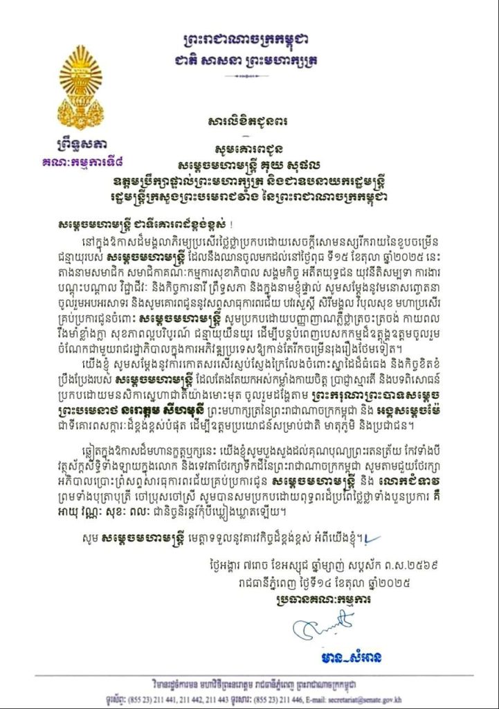សារលិខិតជូនពររបស់លោកជំទាវ មាន សំអាន ប្រធានគណៈកម្មការទី៨ព្រឹទ្ធសភា គោរពជូនសម្តេចមហាមន្ត្រី គុយ សុផល ឧត្តមប្រឹក្សាផ្ទាល់ព្រះមហាក្សត្រ និងជាឧបនាយករដ្ឋមន្ត្រី រដ្ឋមន្ត្រីក្រសួងព្រះបរមរាជវាំង នៃព្រះរាជាណាចក្រកម្ពុជា ក្នុងឱកាសនៃខួបចម្រើនជន្មាយុរបស់សម្តេចមហាមន្ត្រី ដែលនឹងឈានចូលមកដល់នៅថ្ងៃពុធ ទី១៥ ខែតុលា ឆ្នាំ២០២៥ នេះ