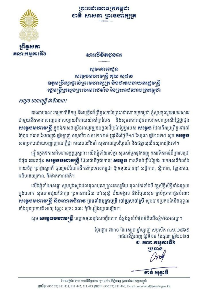 សារលិខិតជូនពររបស់ជំទាវបណ្ឌិត ចាន់ សុទ្ធាវី ប្រធានគណៈកម្មការទី៦ព្រឹទ្ធសភា គោរពជូនសម្តេចមហាមន្ត្រី គុយ សុផល ឧត្តមប្រឹក្សាផ្ទាល់ព្រះមហាក្សត្រ និងជាឧបនាយករដ្ឋមន្ត្រី រដ្ឋមន្ត្រីក្រសួងព្រះបរមរាជវាំង នៃព្រះរាជណាចក្រកម្ពុជា ក្នុងឱកាសចម្រើនអាយុវឌ្ឍនមង្គលដ៏ប្រពៃថ្លៃថ្លារបស់សម្តេច ដែលនឹងប្រព្រឹត្តទៅនៅថ្ងៃពុធ ទី១៥ ខែតុលា ឆ្នាំ២០២៥នេះ