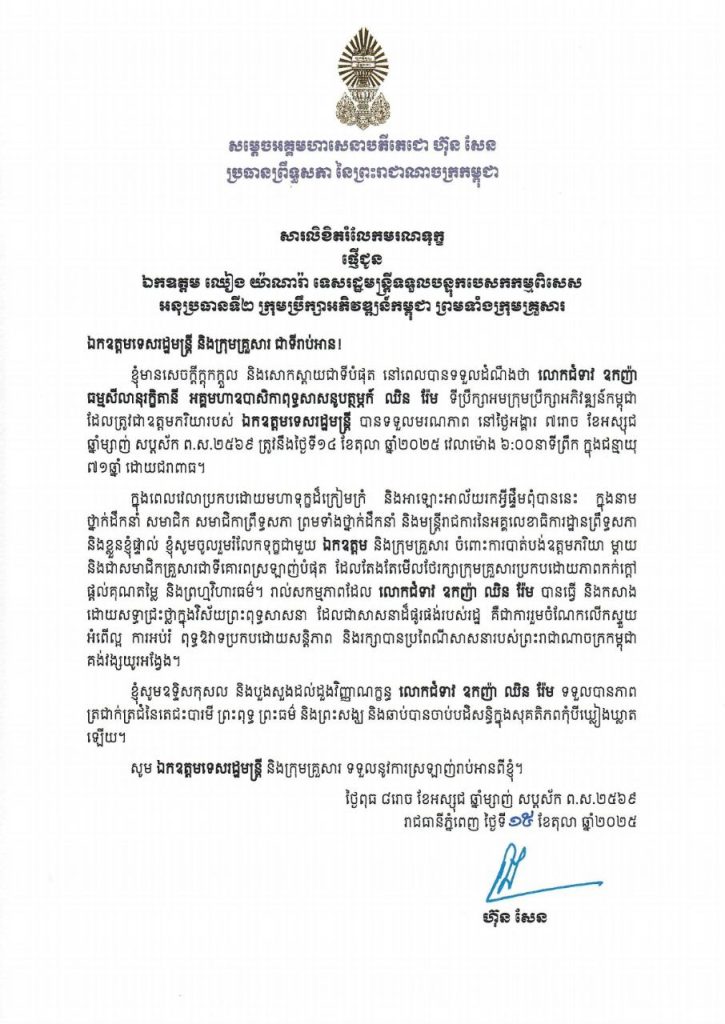 សារលិខិតរំលែកមរណទុក្ខរបស់សម្តេចអគ្គមហាសេនាបតីតេជោ ហ៊ុន សែន ប្រធានព្រឹទ្ធសភា នៃព្រះរាជាណាចក្រកម្ពុជា ជូនឯកឧត្តម ឈៀង យ៉ាណារ៉ា ទេសរដ្ឋមន្ត្រីទទួលបន្ទុកបេសកកម្មពិសេស អនុប្រធានទី២ ក្រុមប្រឹក្សាអភិវឌ្ឍន៍កម្ពុជា ព្រមទាំងក្រុមគ្រួសារ ចំពោះមរណភាពលោកជំទាវឧកញ៉ា ធម្មសីលានុរក្ខិតានី អគ្គមហាឧបាសិកាពុទ្ធសាសនូបត្ថម្ភក៏ ឈិន រ៉ែម ទីប្រឹក្សាអមក្រុមប្រឹក្សាអភិវឌ្ឍន៍កម្ពុជា ដែលត្រូវជាឧត្តមភរិយារបស់ឯកឧត្តមទេសរដ្ឋមន្ត្រី បានទទួលមរណភាពនៅថ្ងៃអង្គារ ទី១៤ ខែតុលា ឆ្នាំ២០២៥ វេលាម៉ោង ៦:០០នាទីព្រឹក ក្នុងជន្មាយុ ៧១ឆ្នាំ ដោយជរាពាធ