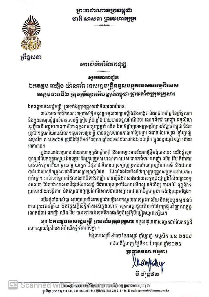 សារលិខិតរំលែកទុក្ខរបស់ឯកឧត្តម ងី ច័ន្ទ្រផល ប្រធានគណៈកម្មការទី១ព្រឹទ្ធសភា គោរពជូនឯកឧត្តម ឈៀង យ៉ាណារ៉ា ទេសរដ្ឋមន្ត្រីទទួលបន្ទុកបេសកកម្មពិសេស អនុប្រធានទី២ ក្រុមប្រឹក្សាអភិវឌ្ឍន៍កម្ពុជា ព្រមទាំងក្រុមគ្រួសារ ចំពោះមរណភាពលោកជំទាវ ឧកញ៉ា ធម្មសីលា នុរក្ខិតានី អគ្គមហាឧបាសិកាពុទ្ធសាសនូបត្ថម្ភក៏ ឈិន រ៉ែម ទីប្រឹក្សាអមក្រុមប្រឹក្សាអភិវឌ្ឍន៍កម្ពុជា ដែល ត្រូវជាឧត្តមភរិយារបស់ឯកឧត្តមទេសរដ្ឋមន្ត្រី បានទទួលមរណភាពនៅថ្ងៃអង្គារ ទី១៤ ខែតុលា ឆ្នាំ២០២៥ វេលាម៉ោង៦:០០នាទីព្រឹក ក្នុងជន្មាយុ៧១ឆ្នាំ ដោយ រោគាពាធ