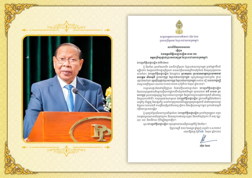• សារលិខិតអបអរសាទររបស់សម្តេចអគ្គមហាសេនាបតីតេជោ ហ៊ុន សែន ប្រធានព្រឹទ្ធសភា នៃព្រះរាជាណាចក្រកម្ពុជា ជូនឯកឧត្តមកិត្តិសេដ្ឋាបណ្ឌិត ឆាយ ថន ដែលត្រូវបាន ព្រះករុណា ព្រះបាទសម្តេចព្រះបរមនាថ នរោត្តម សីហមុនី ព្រះមហាក្សត្រ នៃព្រះរាជាណាចក្រកម្ពុជា ស្ដេចទ្រង់សព្វព្រះរាជហឫទ័យ ត្រាស់បង្គាប់តែងតាំងជា «ឧត្តមប្រឹក្សាផ្ទាល់ព្រះមហាក្សត្រ នៃព្រះរាជាណាចក្រកម្ពុជា»