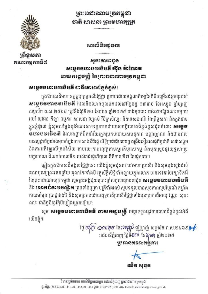 សារលិខិតជូនពររបស់ឯកឧត្តម ឈិត សុខុន ប្រធានគណៈកម្មការទី៧ព្រឹទ្ធសភា គោរពជូន សម្តេចមហាបវរធិបតី ហ៊ុន ម៉ាណែត នាយករដ្ឋមន្ត្រី នៃព្រះរាជាណាចក្រកម្ពុជា ក្នុងឱកាសដ៏មហានក្ខត្តឫក្សប្រសើរថ្លៃថ្លា ប្រកបដោយមង្គលាភិរម្យនៃពិធីចម្រើនជន្មាយុរបស់សម្តេចមហាបវរធិបតី ដែលនឹងឈានចូលមកដល់នៅថ្ងៃចន្ទ ទី២០ ខែតុលា ឆ្នាំ២០២៥ ខាងមុខនេះ
