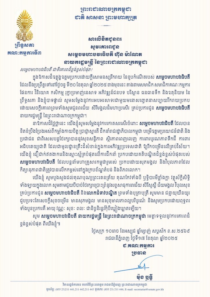 សារលិខិតជូនពររបស់ឯកឧត្តមបណ្ឌិត ម៉ុង ឫទ្ធី ប្រធានគណៈកម្មការទី៣ព្រឹទ្ធសភា គោរពជូន សម្តេចមហាបវរធិបតី ហ៊ុន ម៉ាណែត នាយករដ្ឋមន្ត្រី នៃព្រះរាជាណាចក្រកម្ពុជា ក្នុងឱកាសដ៏ឧត្តុង្គឧត្តមប្រកបដោយក្តីសោមនស្សរីករាយ នៃខួបកំណើតរបស់សម្តេចមហាបវរធិបតី ដែលនឹងប្រព្រឹត្តទៅនៅថ្ងៃចន្ទ ទី២០ ខែតុលា ឆ្នាំ២០២៥ ខាងមុខនេះ