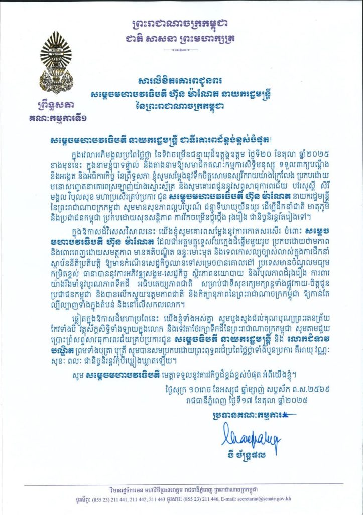 សារលិខិតគោរពជូនពររបស់ឯកឧត្តម ងី ច័ន្ទ្រផល ប្រធានគណៈកម្មការទី១ព្រឹទ្ធសភា គោរពជូន សម្តេចមហាបវរធិបតី ហ៊ុន ម៉ាណែត នាយករដ្ឋមន្ត្រី នៃព្រះរាជាណាចក្រកម្ពុជា ក្នុងវេលាអភិមង្គលប្រពៃថ្លៃថ្លា នៃទិវាចម្រើនជន្មាយុដ៏ឧត្តុង្គឧត្តម ថ្ងៃទី២០ ខែតុលា ឆ្នាំ២០២៥ ខាងមុខនេះ
