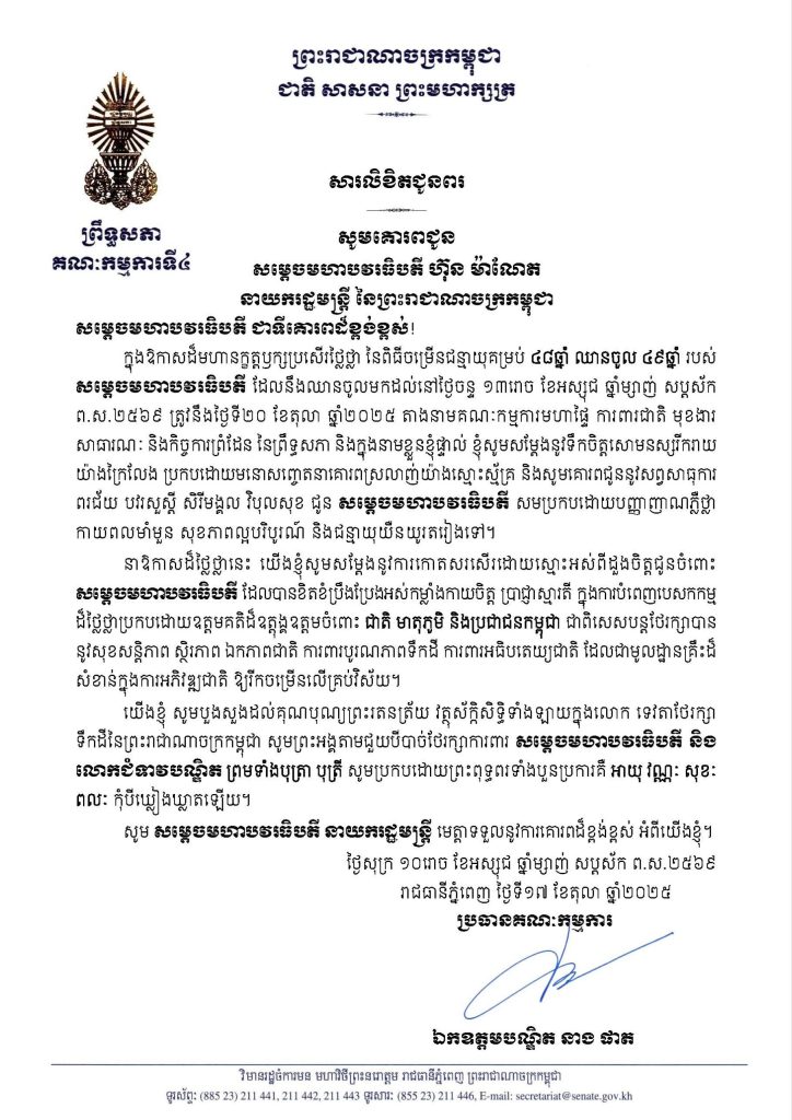 សារលិខិតជូនពររបស់ឯកឧត្តមបណ្ឌិត នាង ផាត ប្រធានគណៈកម្មការទី៤ព្រឹទ្ធសភា គោរពជូនសម្តេចមហាបវរធិបតី ហ៊ុន ម៉ាណែត នាយករដ្ឋមន្ត្រី នៃព្រះរាជាណាចក្រកម្ពុជា ក្នុងឱកាសដ៏មហានក្ខត្តឫក្សប្រសើរថ្លៃថ្លា នៃពិធីចម្រើនជន្មាយុគម្រប់ ៤៨ឆ្នាំ ឈានចូល ៤៩ឆ្នាំ របស់សម្តេចមហាបវរធិបតី ដែលនឹងឈានចូលមកដល់នៅថ្ងៃចន្ទ ទី២០ ខែតុលា ឆ្នាំ២០២៥