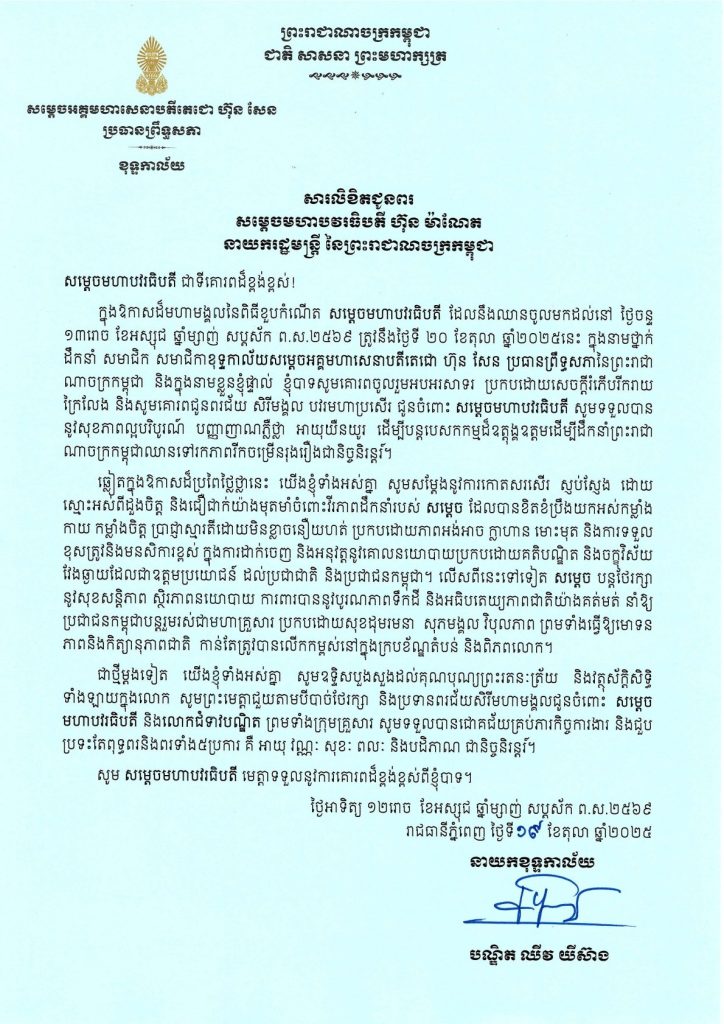 សារលិខិតជូនពររបស់ឯកឧត្តមបណ្ឌិត ឈីវ យីស៊ាង នាយកខុទ្ទកាល័យសម្តេចតេជោ ប្រធានព្រឹទ្ធសភា គោរពជូន សម្តេចមហាបវរធិបតី ហ៊ុន ម៉ាណែត នាយករដ្ឋមន្ត្រី នៃព្រះរាជាណចក្រកម្ពុជា ក្នុងឱកាសដ៏មហាមង្គលនៃពិធីខួបកំណើតសម្តេចមហាបវរធិបតី ដែលនឹងឈានចូលមកដល់នៅថ្ងៃចន្ទ ទី២០ ខែតុលា ឆ្នាំ២០២៥នេះ