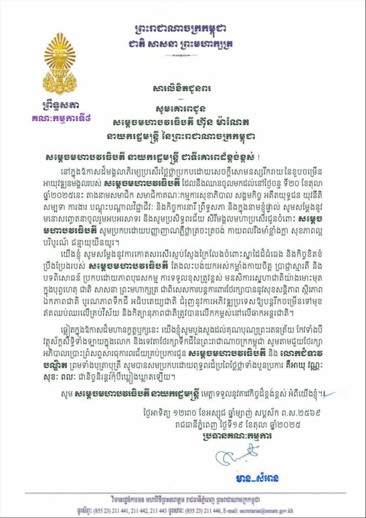 សារលិខិតជូនពររបស់លោកជំទាវ មាន សំអាន ប្រធានគណៈកម្មការទី៨ព្រឹទ្ធសភា គោរពជូនសម្តេចមហាបវរធិបតី ហ៊ុន ម៉ាណែត នាយករដ្ឋមន្ត្រី នៃព្រះរាជាណាចក្រកម្ពុជា ក្នុងឱកាសដ៏មង្គលាភិរម្យប្រសើរថ្លៃថ្លាប្រកបដោយសេចក្តីសោមនស្សរីករាយ នៃខួបចម្រើនអាយុវឌ្ឍនមង្គលរបស់សម្តេចមហាបវរធិបតី ដែលនឹងឈានចូលមកដល់នៅថ្ងៃចន្ទ ទី២០ ខែតុលា ឆ្នាំ២០២៥នេះ