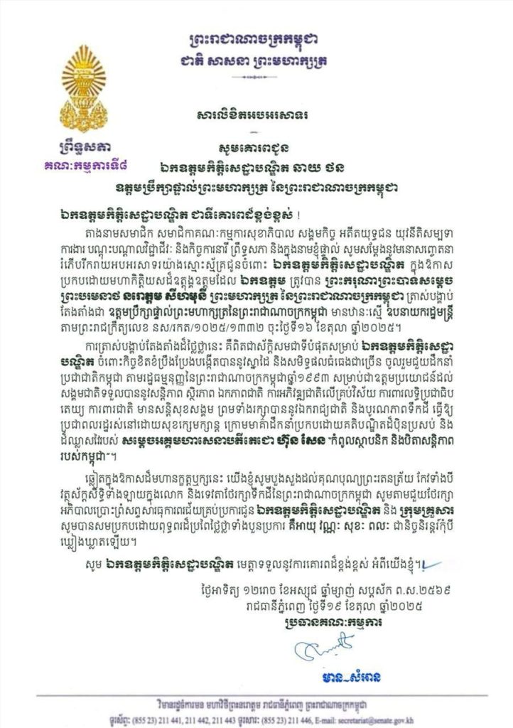 • សារលិខិតអបអរសាទរលោកជំទាវ មាន សំអាន ប្រធានគណៈកម្មការ​ទី៨ព្រឹទ្ធសភា គោរពជូនឯកឧត្តមកិត្តិសេដ្ឋាបណ្ឌិត ឆាយ ថន ក្នុងឱកាសប្រកបដោយមហាកិត្តិយសដ៏ឧត្តុង្គឧត្តមដែលឯកឧត្តមត្រូវបានព្រះករុណាព្រះបាទសម្តេច ព្រះបរមនាថ នរោត្តម សីហមុនី ព្រះមហាក្សត្រ នៃព្រះរាជាណាចក្រកម្ពុជា ត្រាស់បង្គាប់តែងតាំងជា «ឧត្តមប្រឹក្សាផ្ទាល់ព្រះមហាក្សត្រនៃព្រះរាជាណាចក្រកម្ពុជា»