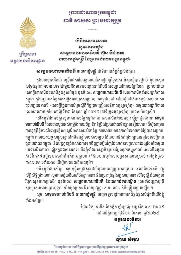 លិខិតអបអរសាទររបស់ឯកឧត្តម ឡាយ សំកុល អគ្គលេខាធិការព្រឹទ្ធសភា សូមគោរពជូនសម្តេចមហាបវរធិបតី ហ៊ុន ម៉ាណែត នាយករដ្ឋមន្ត្រី នៃព្រះរាជាណាចក្រកម្ពុជា ក្នុងឱកាសដែលសម្តេចមហាបវរធិបតី ដឹកនាំរាជរដ្ឋាភិបាលកម្ពុជា ក្នុងបុព្វហេតុស្វែងរកសន្តិភាពរហូតសម្រេចបានលទ្ធផលជោគជ័យជូនជាតិមាតុភូមិ តាមរយៈការ ចុះហត្ថលេខាលើ «សេចក្តីថ្លែងការណ៍រួមស្តីពីកិច្ចព្រមព្រៀងសន្តិភាពគូឡាឡាំពួ» ជាមួយរាជរដ្ឋាភិបាល ព្រះរាជាណាចក្រថៃ នៅថ្ងៃទី២៦ ខែតុលា ឆ្នាំ២០២៥ នៅទីក្រុងគូឡាឡាំពួ ប្រទេសម៉ាឡេស៊ី