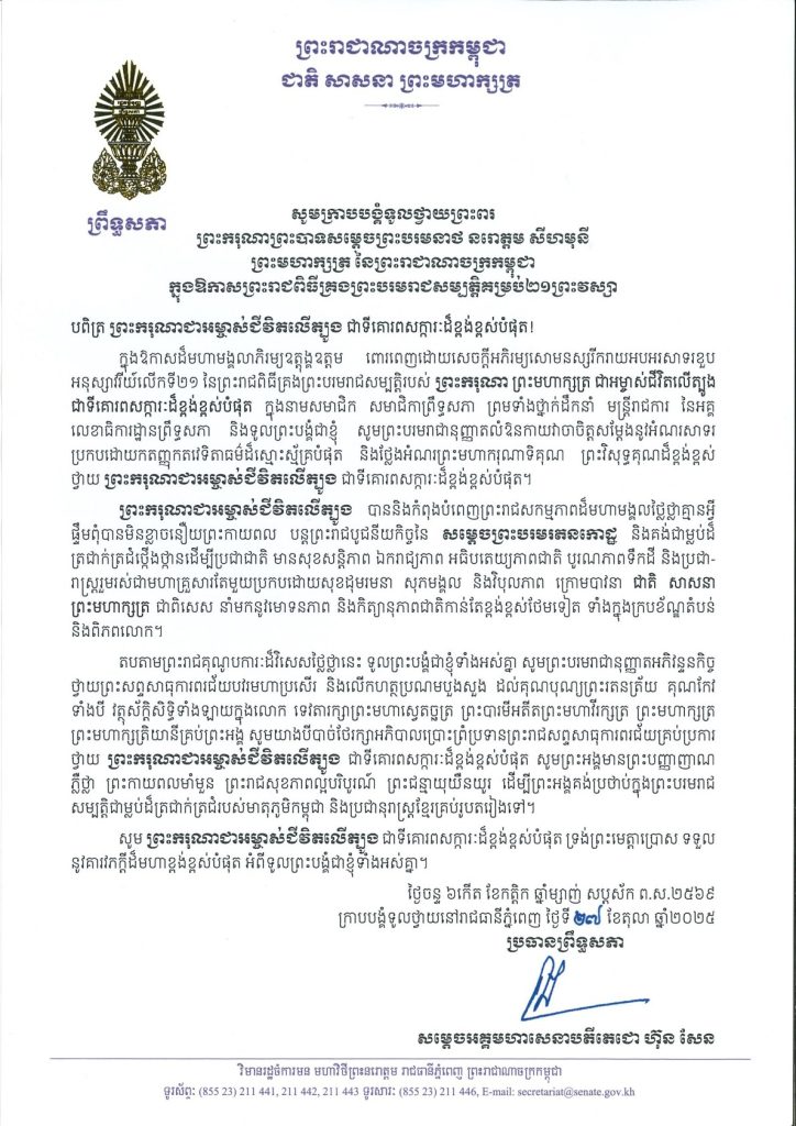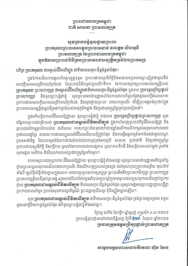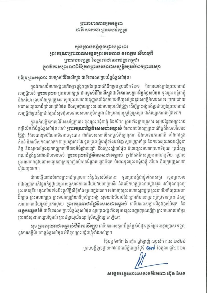 សារលិខិតថ្វាយព្រះពររបស់ សម្តេចអគ្គមហាសេនាបតីតេជោ ហ៊ុន សែន ប្រធានព្រឹទ្ធសភា ប្រធានក្រុមឧត្តមប្រឹក្សាផ្ទាល់ព្រះមហាក្សត្រ និងក្នុងនាមសម្តេច ថ្វាយព្រះពរ ព្រះករុណាព្រះបាទសម្តេចព្រះបរមនាថ នរោត្តម សីហមុនី ព្រះមហាក្សត្រ នៃព្រះរាជាណាចក្រកម្ពុជា ក្នុងឱកាសដ៏មហាមង្គលាភិរម្យឧត្តុង្គឧត្តមនៃព្រះរាជពិធីគម្រប់ខួបលើកទី២១ នៃការយាងគ្រងព្រះបរមរាជសម្បត្តិរបស់ ព្រះករុណា ព្រះមហាក្សត្រ ជាអម្ចាស់ជីវិតលើត្បូងជាទីគោរពសក្ការៈដ៏ខ្ពង់ខ្ពស់បំផុត