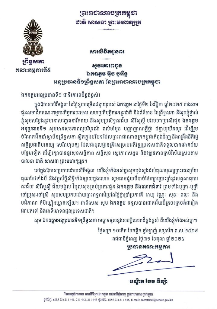 សារលិខិតជូនពររបស់ឯកឧត្តមបណ្ឌិត ចែម វីឌ្យ៉ា ប្រធានគណៈកម្មការទី៥ព្រឹទ្ធសភា គោរពជូនឯកឧត្តម អ៊ុច បូររិទ្ធ អនុប្រធានទី១ព្រឹទ្ធសភា នៃព្រះរាជាណាចក្រកម្ពុជា ក្នុងឱកាសសិរីមង្គល នៃថ្ងៃខួបចម្រើនជន្មាយុរបស់ ឯកឧត្តម នាថ្ងៃទី២ ខែវិច្ឆិកា ឆ្នាំ២០២៥