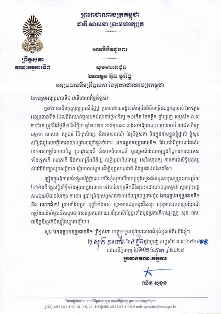 សារលិខិតជូនពររបស់ឯកឧត្តម ឈិត សុខុន ប្រធានគណៈកម្មការទី៧ព្រឹទ្ធសភា គោរពជូនឯកឧត្តម អ៊ុច បូររិទ្ធ អនុប្រធានទី១ព្រឹទ្ធសភា នៃព្រះរាជាណាចក្រកម្ពុជា ក្នុងឱកាសដ៏នក្ខត្តឫក្សប្រសើរថ្លៃថ្លា ប្រកបដោយមង្គលាភិរម្យនៃពិធីចម្រើនជន្មាយុរបស់ឯកឧត្តម អនុប្រធានទី១ ដែលនឹងឈានចូលមកដល់នៅថ្ងៃអាទិត្យ ទី២ ខែវិច្ឆិកា ឆ្នាំ២០២៥ ខាងមុខនេះ