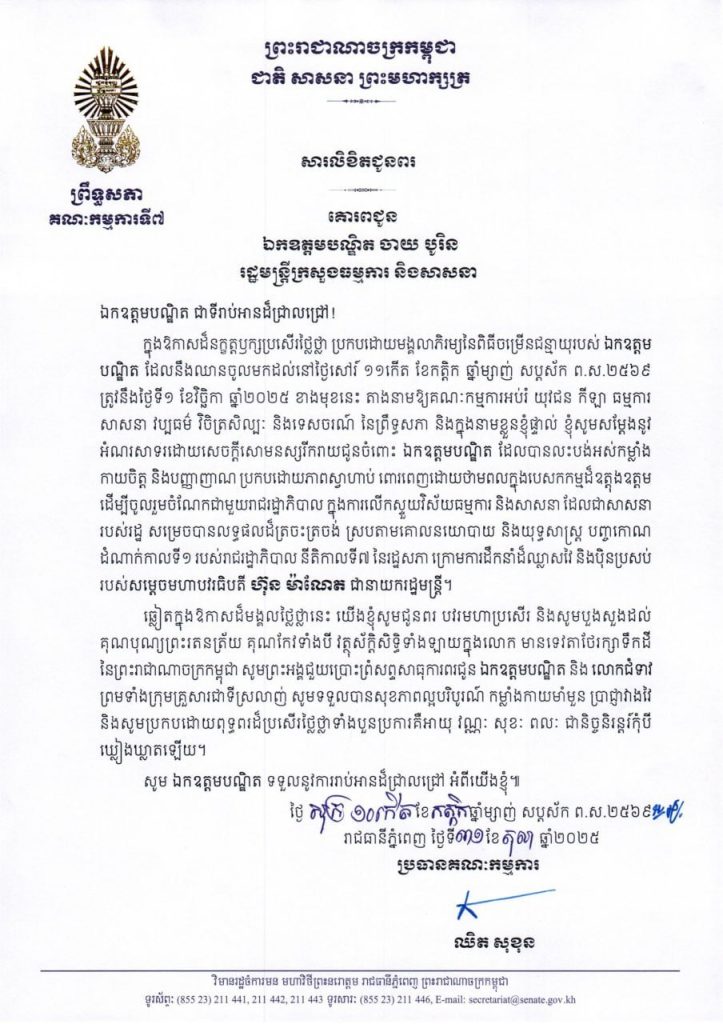 សារលិខិតជូនពររបស់ឯកឧត្តម ឈិត សុខុន ប្រធានគណៈកម្មការទី៧ព្រឹទ្ធសភា គោរពជូនឯកឧត្តមបណ្ឌិត ចាយ បូរិន រដ្ឋមន្ត្រីក្រសួងធម្មការ និងសាសនា ក្នុងឱកាសដ៏នក្ខត្តឫក្សប្រសើរថ្លៃថ្លា ប្រកបដោយមង្គលាភិរម្យនៃពិធីចម្រើនជន្មាយុរបស់ឯកឧត្តមបណ្ឌិត ដែលនឹងឈានចូលមកដល់នៅថ្ងៃសៅរ៍ ទី១ ខែវិច្ឆិកា ឆ្នាំ២០២៥ ខាងមុខនេះ