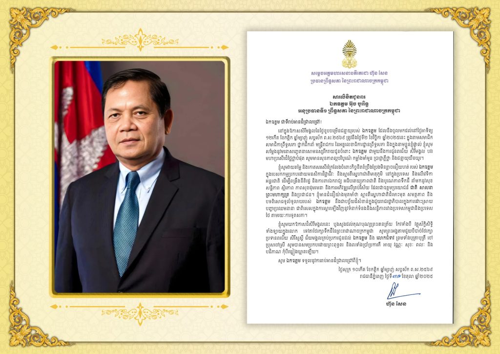 សារលិខិតជូនពររបស់សម្តេចអគ្គមហាសេនាបតីតេជោ ហ៊ុន សែន ប្រធានព្រឹទ្ធសភា នៃព្រះរាជាណាចក្រកម្ពុជា ជូនឯកឧត្តម អ៊ុច បូររិទ្ធ អនុប្រធានទី១ ព្រឹទ្ធសភា នៃព្រះរាជាណាចក្រកម្ពុជា នៅក្នុងឱកាសសិរីមង្គលនៃថ្ងៃខួបចម្រើនជន្មាយុរបស់ឯកឧត្តម ដែលនឹងចូលមកដល់នៅថ្ងៃអាទិត្យ ទី២ ខែវិច្ឆិកា ឆ្នាំ២០២៥នេះ
