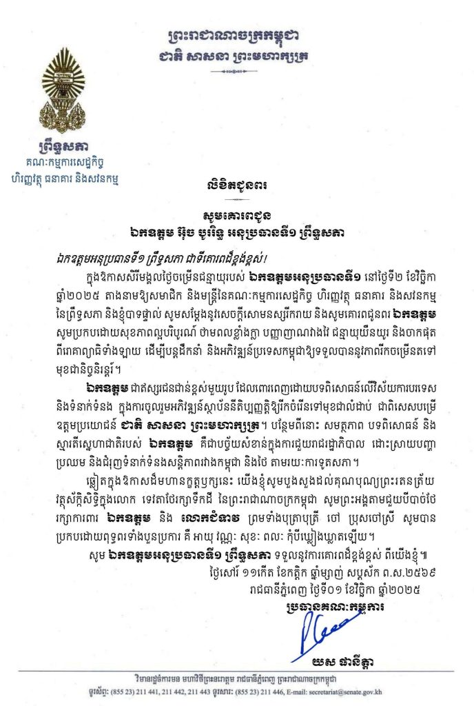 • លិខិតជូនពររបស់ឯកឧត្តម យស ផានីត្តា ប្រធានគណៈកម្មការ​ទី២ព្រឹទ្ធសភា​ គោរពជូនឯកឧត្តម អ៊ុច បូររិទ្ធ អនុប្រធានទី១ ព្រឹទ្ធសភា ក្នុងឱកាសសិរីមង្គលថ្ងៃចម្រើនជន្មាយុរបស់ឯកឧត្តម អនុប្រធានទី១ នៅថ្ងៃទី២ ខែវិច្ឆិកា ឆ្នាំ២០២៥