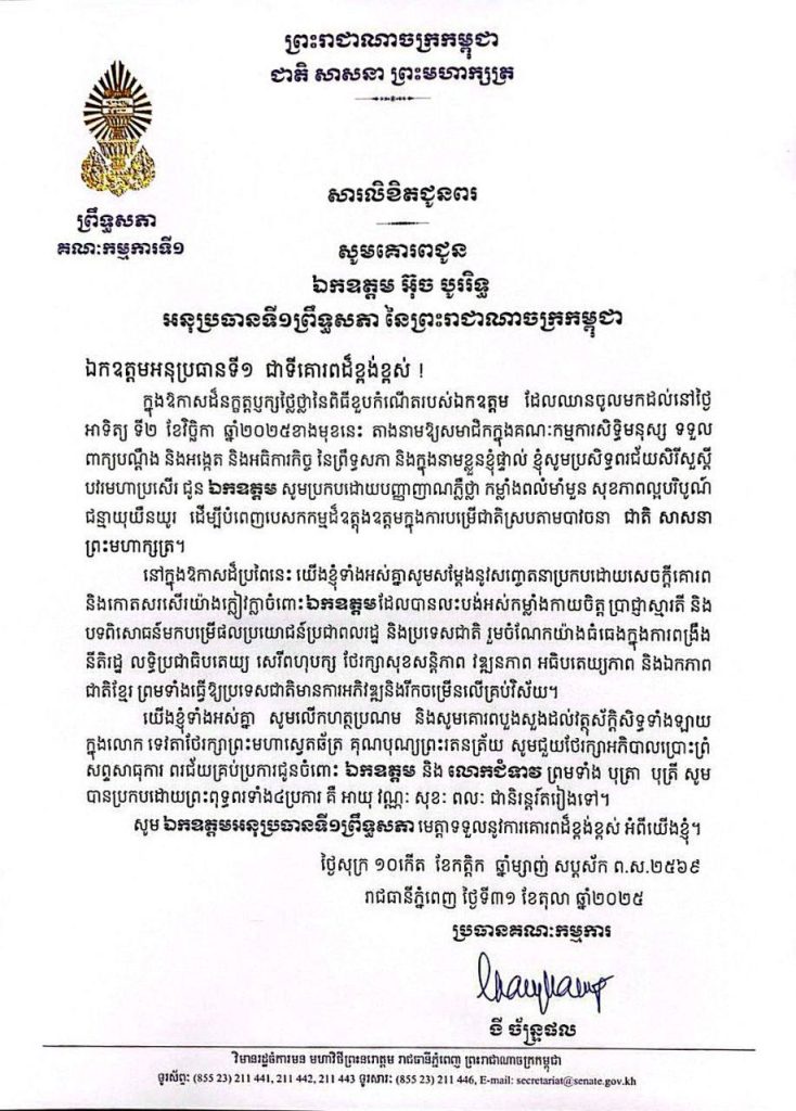 សារលិខិតជូនពររបស់ឯកឧត្តម ងី ច័ន្ទ្រផល ប្រធានគណៈកម្មការទី១ព្រឹទ្ធសភា គោរពជូនឯកឧត្តម អ៊ុច បូររិទ្ធ អនុប្រធានទី១ព្រឹទ្ធសភា នៃព្រះរាជាណាចក្រកម្ពុជា ក្នុងឱកាសដ៏នក្ខត្តឫក្សថ្លៃថ្លានៃពិធីខួបកំណើតរបស់ឯកឧត្តម ដែលឈានចូលមកដល់នៅថ្ងៃ អាទិត្យ ទី២ ខែវិច្ឆិកា ឆ្នាំ២០២៥ខាងមុខនេះ