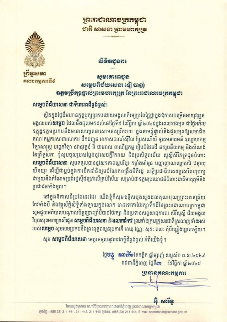 លិខិតជូនពររបស់ឯកឧត្តម អ៊ុំ សារឹទ្ធ ប្រធានគណៈកម្មការទី៩ព្រឹទ្ធសភា គោរពជូនសម្តេចពិជ័យសេនា ទៀ បាញ់ ឧត្តមប្រឹក្សាផ្ទាល់ព្រះមហាក្សត្រ នៃព្រះរាជាណាចក្រកម្ពុជា ក្នុងថ្ងៃដ៏មហានក្ខត្តឫក្សប្រកបដោយមង្គលាភិរម្យប្រពៃថ្លៃថ្លាក្នុងឱកាសចម្រើនអាយុវឌ្ឍន មង្គលរបស់សម្តេច ដែលនឹងចូលមកដល់នៅថ្ងៃទី៥ ខែវិច្ឆិកា ឆ្នាំ២០២៥ ក្នុងពេលខាងមុខ