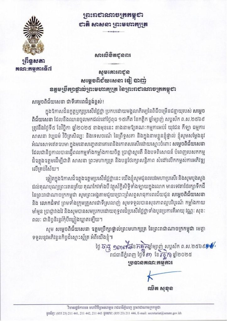 • សារលិខិតជូនពររបស់ឯកឧត្តម ឈិត សុខុន ប្រធានគណៈកម្មការ​ទី៧ព្រឹទ្ធសភា​ គោរពជូនសម្តេចពិជ័យសេនា ទៀ បាញ់ ឧត្តមប្រឹក្សាផ្ទាល់ព្រះមហាក្សត្រ នៃព្រះរាជាណាចក្រកម្ពុជា ក្នុងឱកាសដ៏នក្ខត្តឫក្សប្រសើរថ្លៃថ្លា ប្រកបដោយមង្គលាភិរម្យនៃពិធីចម្រើនជន្មាយុរបស់ សម្តេចពិជ័យសេនា ដែលនឹងឈានចូលមកដល់នៅថ្ងៃពុធ ទី៥ ខែវិច្ឆិកា ឆ្នាំ២០២៥ ខាងមុខនេះ