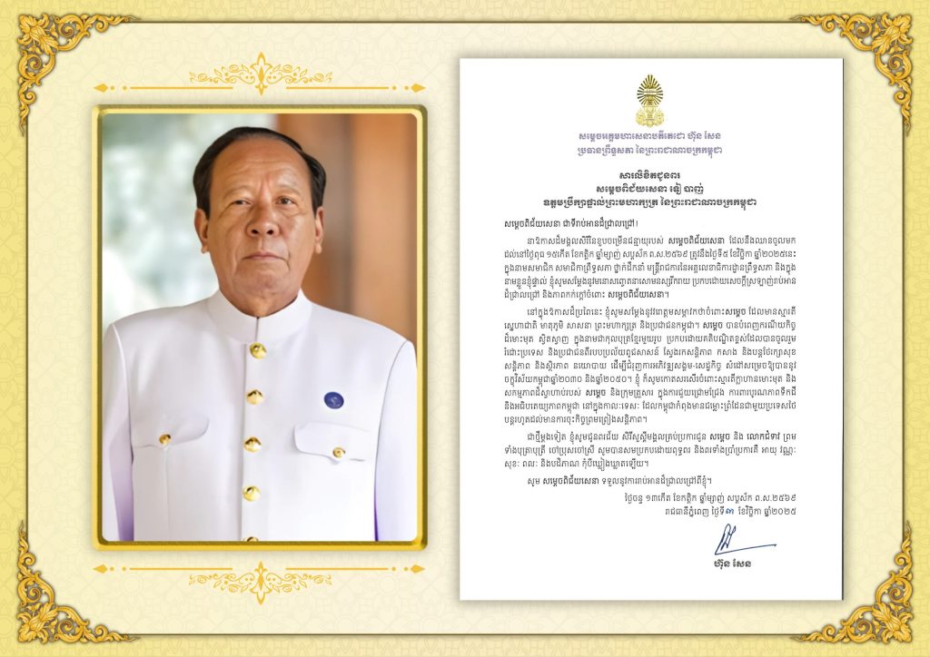 សារលិខិតជូនពររបស់សម្តេចអគ្គមហាសេនាបតីតេជោ ហ៊ុន សែន ប្រធានព្រឹទ្ធសភា នៃព្រះរាជាណាចក្រកម្ពុជា ជូនសម្តេចពិជ័យសេនា ទៀ បាញ់ ឧត្តមប្រឹក្សាផ្ទាល់ព្រះមហាក្សត្រ នៃព្រះរាជាណាចក្រកម្ពុជា នាឱកាសដ៏មង្គលសិរីនៃខួបចម្រើនជន្មាយុរបស់ សម្តេចពិជ័យសេនា ដែលនឹងឈានចូលមកដល់នៅថ្ងៃពុធ ទី៥ ខែវិច្ឆិកា ឆ្នាំ២០២៥នេះ