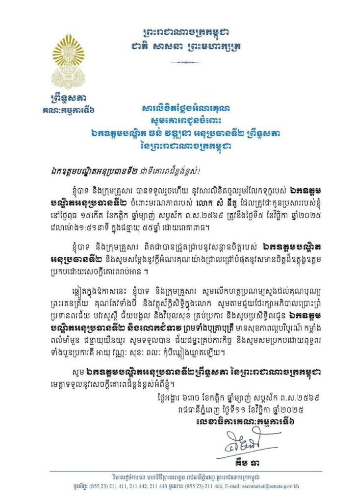 សារលិខិតថ្លែងអំណរគុណរបស់ឯកឧត្តមបណ្ឌិត គឹម ធា លេខាធិការគណៈកម្មការទី៦ព្រឹទ្ធសភា សូមគោរពជូនចំពោះ ឯកឧត្តមបណ្ឌិត ធន់ វឌ្ឍនា អនុប្រធានទី២ព្រឹទ្ធសភា នៃព្រះរាជាណាចក្រកម្ពុជាដែលឯកឧត្តមបណ្ឌិត អនុប្រធានទី២ព្រឹទ្ធសភា បានជូនសារលិខិតរំលែកទុក្ខចំពោះមរណភាពរបស់ លោក សំ នីតូ ដែលត្រូវជាកូនប្រសាររបស់ឯកឧត្តមបណ្ឌិត គឹម ធា នៅថ្ងៃពុធ ទី៥ ខែវិច្ឆិកា ឆ្នាំ២០២៥ វេលាម៉ោង១:៥១នាទី ក្នុងជន្មាយុ ៥៥ឆ្នាំ ដោយរោគាពាធ