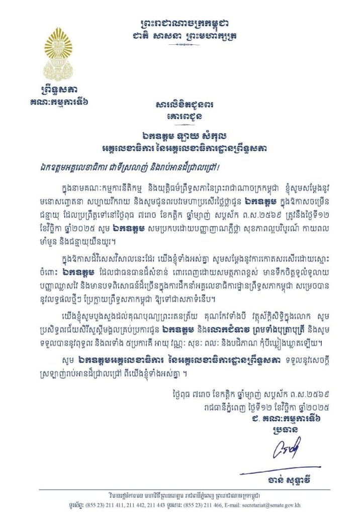 • សារលិខិតជូនពររបស់លោកជំទាវបណ្ឌិត ចាន់ សុទ្ធាវី ប្រធានគណៈកម្មការ​ទី៦ព្រឹទ្ធសភា គោរពជូនឯកឧត្តម ឡាយ សំកុល អគ្គលេខាធិការ នៃអគ្គលេខាធិការដ្ឋានព្រឹទ្ធសភា ក្នុងឱកាសចម្រើនជន្មាយុ ដែលប្រព្រឹត្តទៅនៅថ្ងៃពុធ ទី១២ ខែវិច្ឆិកា ឆ្នាំ២០២៥