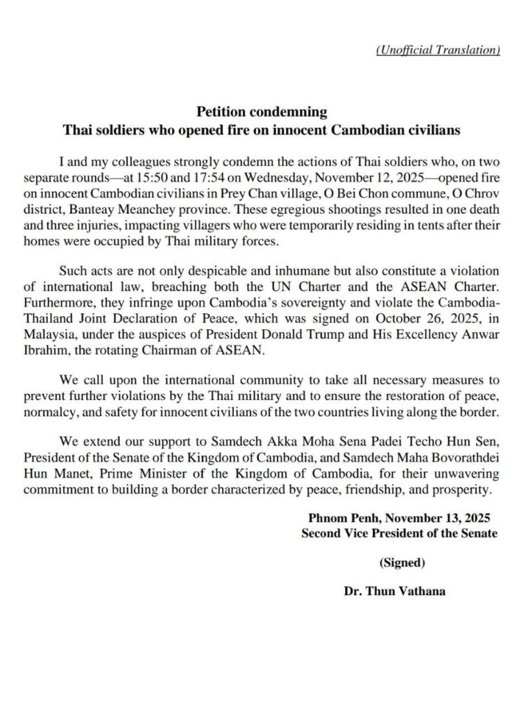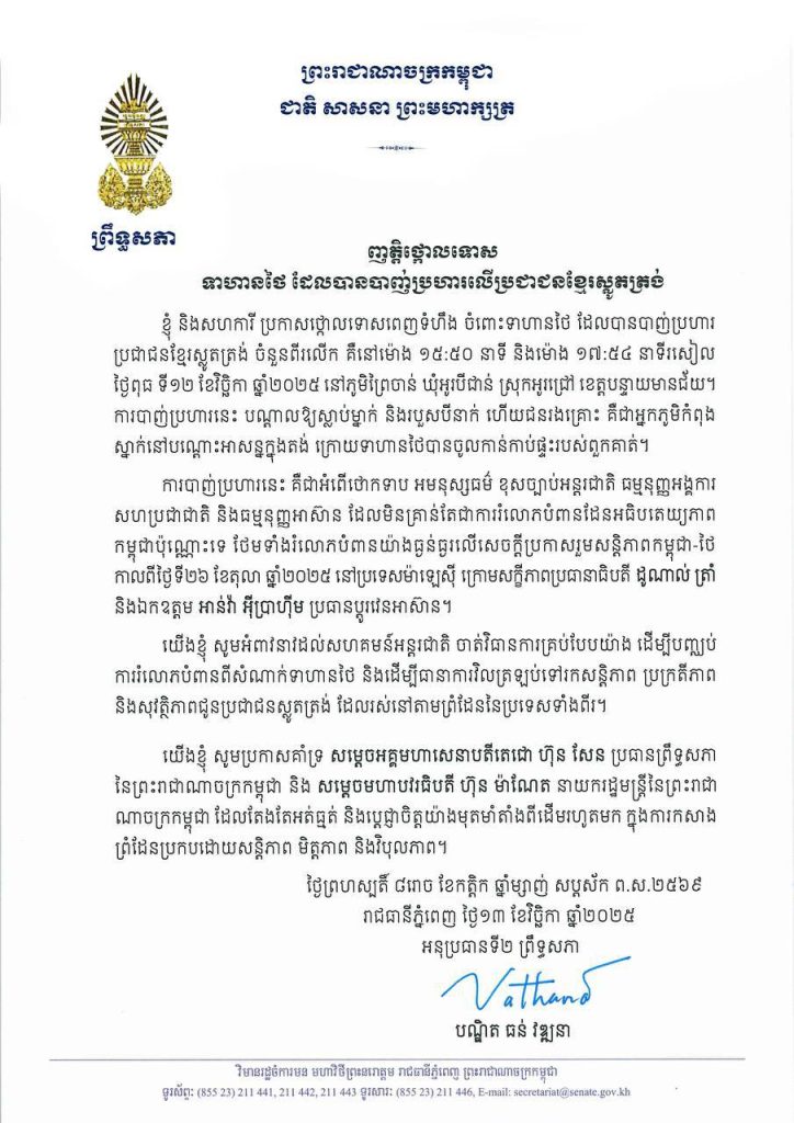 ឯកឧត្តមបណ្ឌិត ធន់ វឌ្ឍនា អនុប្រធានទី២ ព្រឹទ្ធសភា ប្រកាសថ្កោលទោសពេញទំហឹង ចំពោះទាហានថៃ ដែលបានបាញ់ប្រហារប្រជាជនខ្មែរស្លូតត្រង់ ចំនួនពីរលើក គឺនៅម៉ោង ១៥:៥០ នាទី និងម៉ោង ១៧:៥៤ នាទីរសៀល ថ្ងៃពុធ ទី១២ ខែវិច្ឆិកា ឆ្នាំ២០២៥ នៅភូមិព្រៃចាន់ ឃុំអូរបីជាន់ ស្រុកអូរជ្រៅ ខេត្តបន្ទាយមានជ័យ