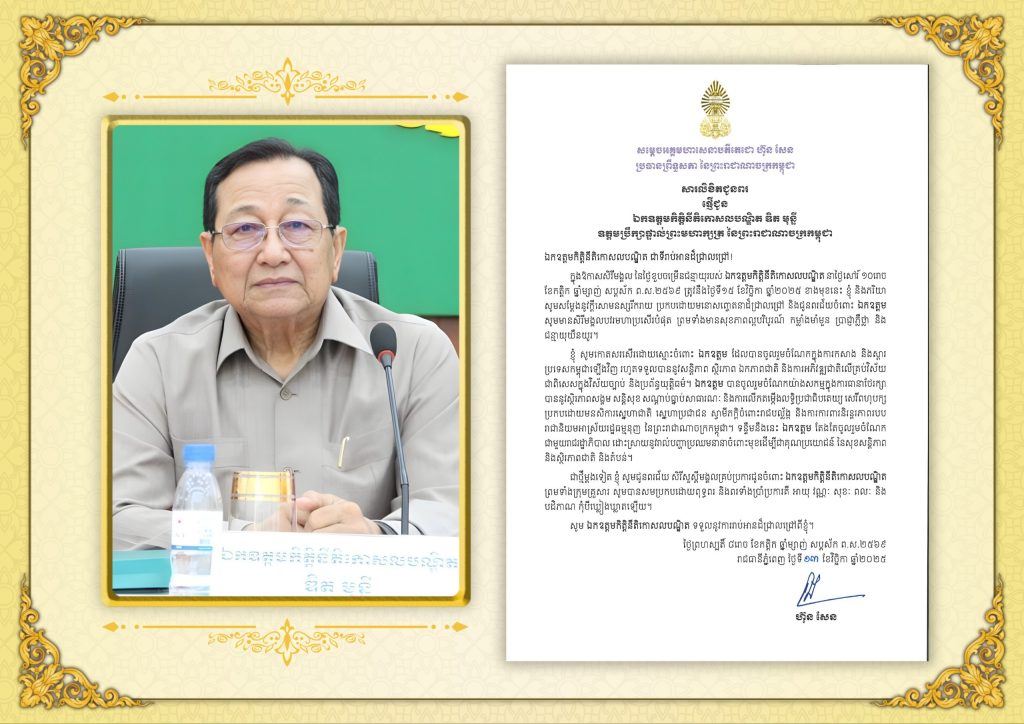 សារលិខិតជូនពររបស់សម្តេចអគ្គមហាសេនាបតីតេជោ ហ៊ុន សែន ប្រធានព្រឹទ្ធសភា នៃព្រះរាជាណាចក្រកម្ពុជា ជូនឯកឧត្តមកិត្តិនីតិកោសលបណ្ឌិត ឌិត មុន្ទី ឧត្តមប្រឹក្សាផ្ទាល់ព្រះមហាក្សត្រ នៃព្រះរាជាណាចក្រកម្ពុជា ក្នុងឱកាសសិរីមង្គល នៃថ្ងៃខួបចម្រើនជន្មាយុរបស់ឯកឧត្តមកិត្តិនីតិកោសលបណ្ឌិត នាថ្ងៃសៅរ៍ ទី១៥ ខែវិច្ឆិកា ឆ្នាំ២០២៥ ខាងមុខនេះ